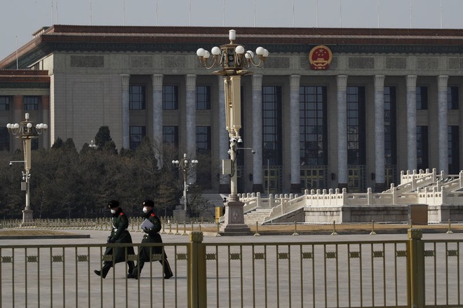 Cảnh sát đeo khẩu trang đi tuần tại quảng trường Thiên An Môn không bóng người ngày 23/2. Ảnh: AP.