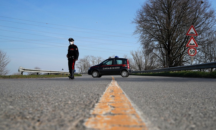 Cảnh sát đeo khẩu trang đứng chốt kiểm tra bên ngoài thị trấn Codogno, vùng Lombardy hôm 24/2. Ảnh: NY Times.