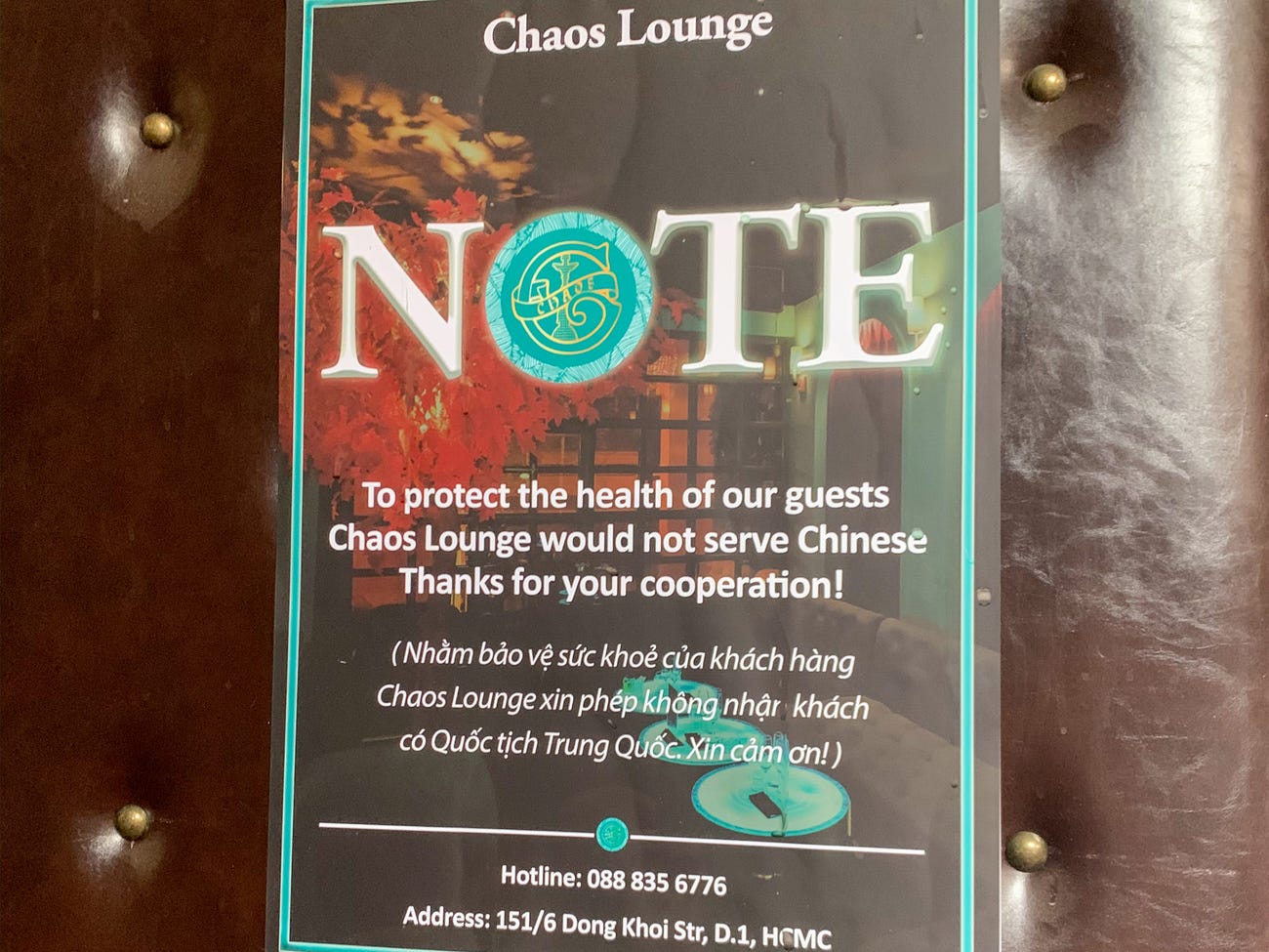 Tin từ Saigon, Việt Nam – Một quán bar ở Saigon đã cấm khách hàng Trung Cộng, khi Việt Nam cố gắng ngăn chặn sự lây lan của coronavirus. Vào hôm thứ ba (25/2), Chaos Lounge thông báo với Business Insider rằng họ không còn cấm khách hàng Trung Cộng nữa. Theo một đại diện, bảng hiệu này được đưa ra do nỗi sợ rằng người dân Trung Cộng đang trốn sang Việt Nam trong nỗ lực thoát khỏi sự lây lan của COVID-19.
