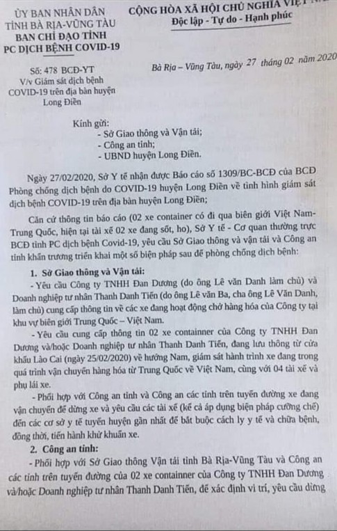 Trước đó vào ngày 27/2, Ban chỉ đạo phòng chống dịch bệnh Covid-19 tỉnh Bà Rịa - Vũng Tàu nhận được thông tin từ Ban chỉ đạo phòng chống dịch Covid-19 huyện Long Điền về 2 tài xế lái xe container đi qua biên giới Việt Nam - Trung Quốc đều có biểu hiện sốt, ho.