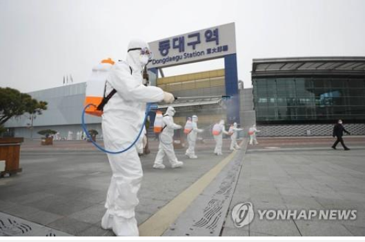 Nhân viên y tế phun thuốc khử trùng trước một nhà ga ở Daegu. (Ảnh: Yonhap)