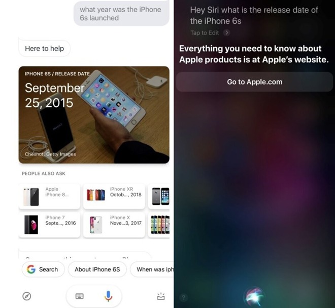 Ví dụ, nếu hỏi Siri về ngày phát hành của iPhone 6s, trợ lư cá nhân này sẽ đưa ra lời khuyên ghé thăm Apple.com để biết câu trả lời. Trong khi đó, Google Assistant sẽ cho biết ngày chính xác và cũng bao gồm các liên kết đến các mẫu iPhone khác và ngày phát hành của chúng. Chưa dừng lại ở đó, Siri dường như có vấn đề về thính giác.