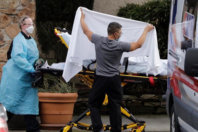 Một bệnh nhân trong nhà dưỡng lão Life Care Center được đưa lên xe cứu thương chuyển đến bệnh viện cách ly sau khi xuất hiện triệu chứng nặng, nghi nhiễm virus corona. Ảnh: AP.