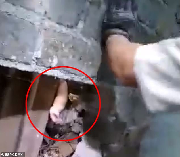 Cánh tay của đứa bé bị mẹ bỏ rơi giữa gạch đá. Ảnh: SSP CDMX