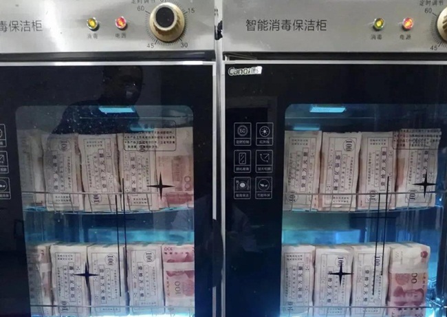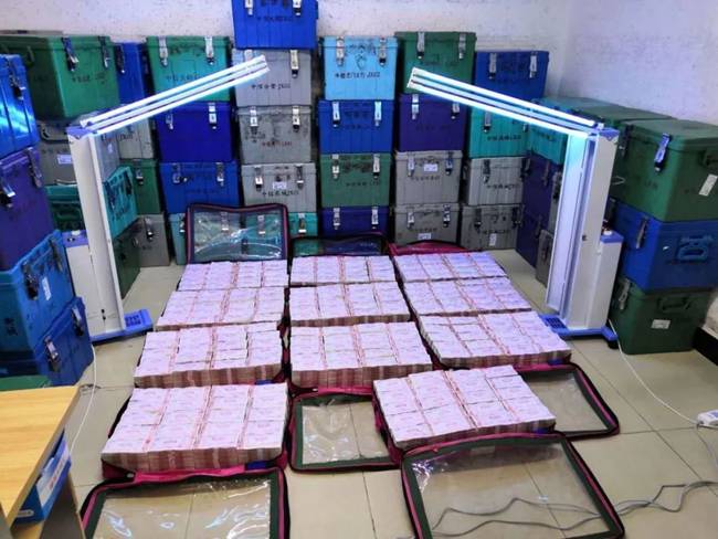 Hình ảnh các cọc tiền đang được khử trùng tại ngân hàng ở Trung Quốc.