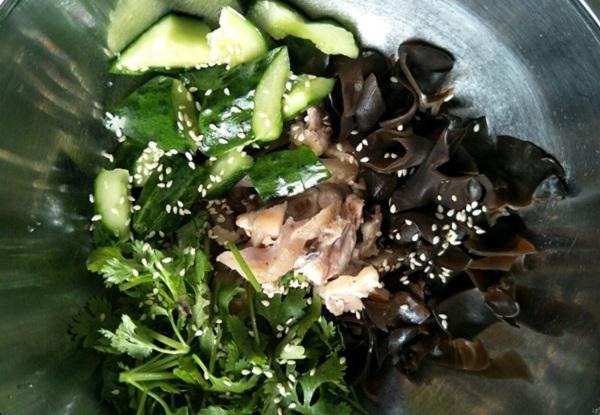 - Bước 2: Đổ nước tương, dầu mè, dầu ớt, giấm, đường vào bát trộn đều. Cho thịt luộc vào tô rồi thêm dưa chuột, mộc nhĩ, rau mùi, ớt thái nhỏ, tỏi băm vào. Cuối cùng đổ nước tương vừa pha vào trộn đều, thêm chút vừng rang chín vào là hoàn thành.