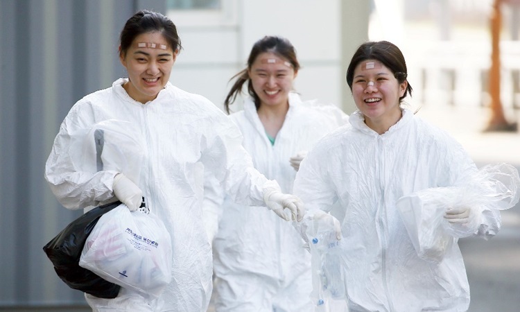 Nhân viên y tế phụ trách chăm sóc bệnh nhân nhiễm nCoV tại một bệnh viện ở Daegu, Hàn Quốc hôm 8/3. Ảnh: AFP.