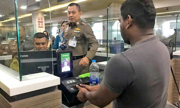 Nhân viên kiểm soát xuất nhập cảnh Thái Lan hướng dẫn hành khách lấy vân tay. Ảnh: Thaiger.