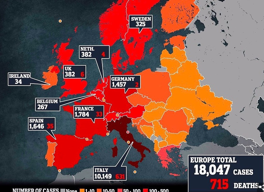 Tổ chức Y tế thế giới (WHO) cảnh báo, dịch Covid-19 hiện lan truyền giữa người và người ở gần 30 quốc gia khắp châu Âu. Nỗi lo về dịch bệnh chết người này hiện đang bao trùm toàn châu Âu, với số ca nhiễm virus đã vượt quá con số 17.000 và số ca tử vong là hơn 700.