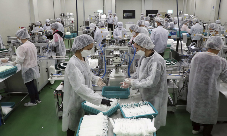 Công nhân sản xuất khẩu trang ở nhà máy Wooil C&Tech ở Pyeongtaek hồi đầu tháng 3. Ảnh: AP.
