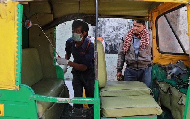 Nhân viên chính quyền phun khử trùng một phương tiện ở thủ đô New Delhi, Ấn Độ hôm 17/3. Ảnh: Reuters