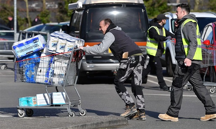 Dân địa phương đẩy xe chất đầy giấy vệ sinh khỏi một siêu thị ở Liverpool, Anh ngày 16/3. Ảnh: AFP.