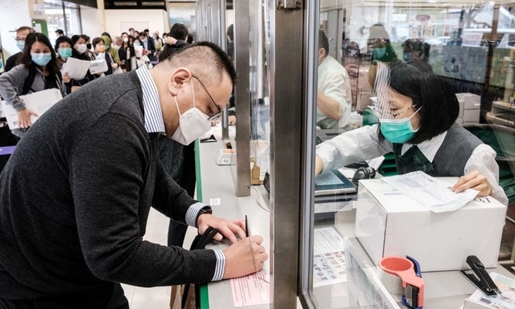 Một người gửi khẩu trang cho bố mẹ ở Canada tại bưu cục Hong Kong ngày 17/3. Ảnh: AFP.
