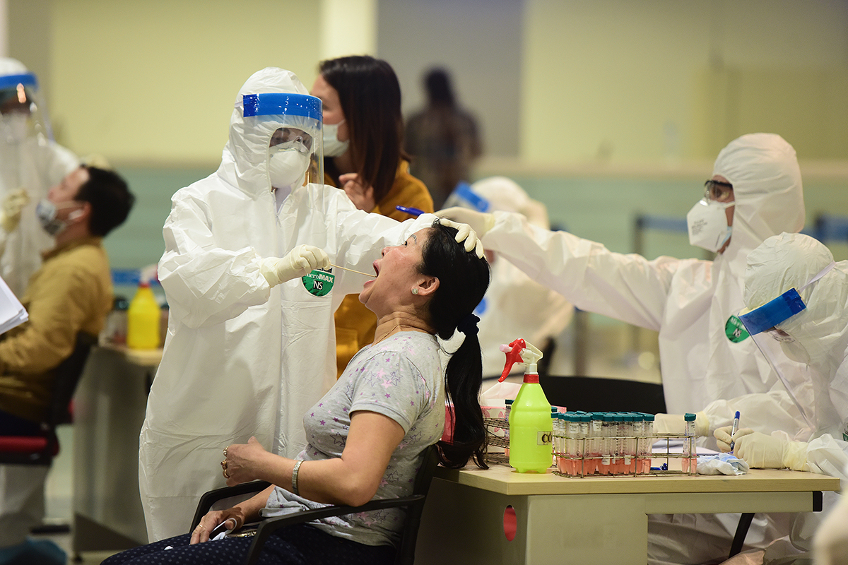 Lấy mẫu bệnh phẩm khách nhập cảnh tại sân bay Nội Bài xét nghiệm nCoV, ngày 18/3. Ảnh: Giang Huy.