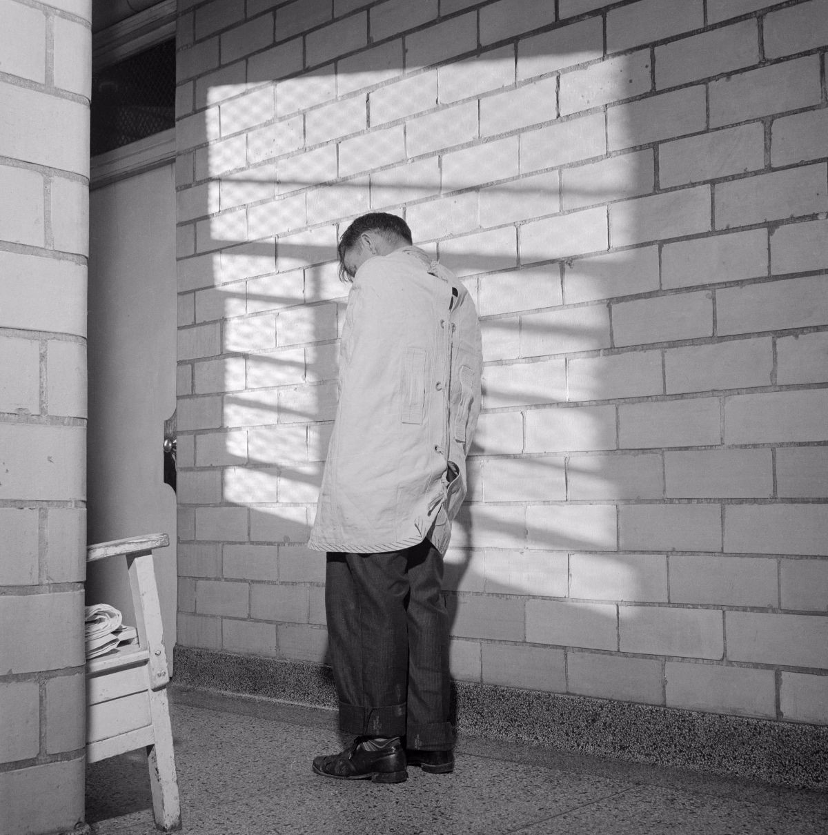 Vẻ mặt thất thần của một nam bệnh nhân trong phòng tập thể. Bài báo của Life mô tả điều kiện sống ở bệnh viện không khác một trại tị nạn, nơi bệnh nhân bị đối xử tệ và thường bị bỏ mặc trong nhiều ngày mà không có sự chú ý nào.
