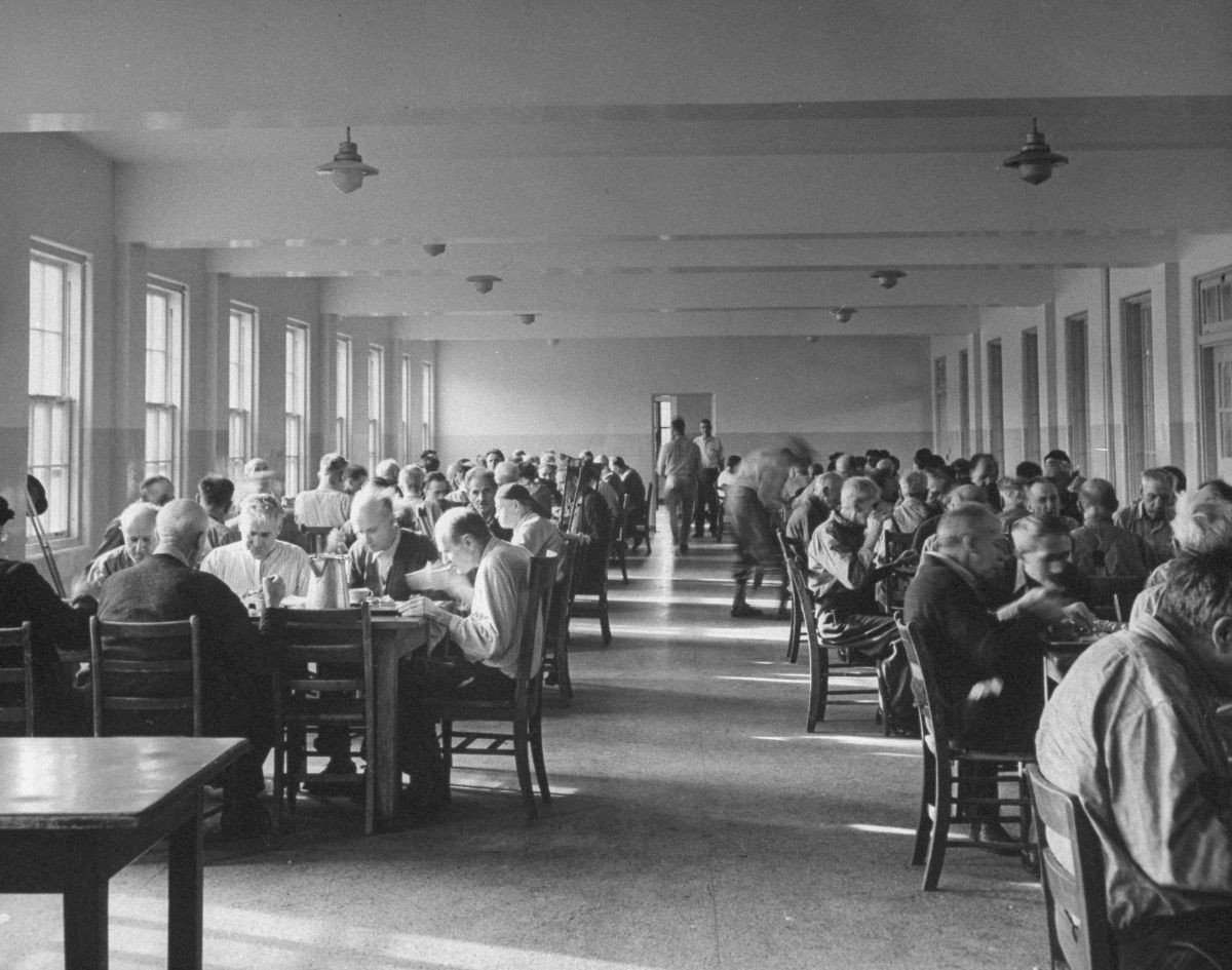 Những bệnh nhân tâm thần ngồi quanh hành lang tại bệnh viện bang Cleveland, một sơ sở chuyên điều trị bệnh tâm thần ở thành phố Ohio, nước Mỹ năm 1946.