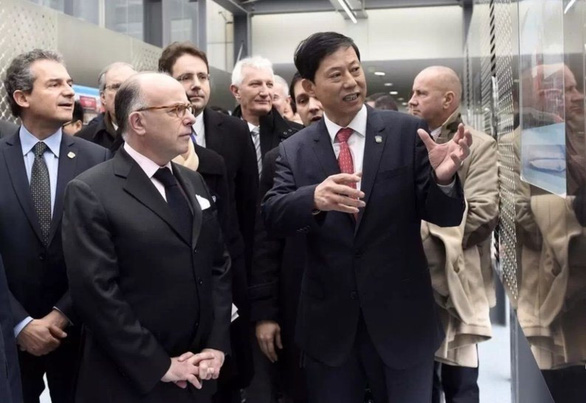 Thủ tướng Pháp Bernard Cazeneuve (thứ hai từ trái sang ở hàng đầu) dự lễ khánh thành pḥng thí nghiệm nghiên cứu virus ở Vũ Hán vào tháng 2-2017 – Ảnh: cn.ambafrance.org
