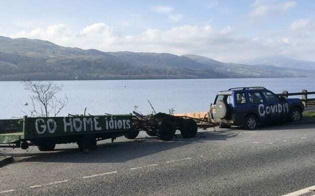 Một chiếc ôtô và xe kéo sơn dòng chữ "Hãy về nhà đi lũ ngốc" và "Covid-19" ở Bala, xứ Wales. Ảnh: Telegraph