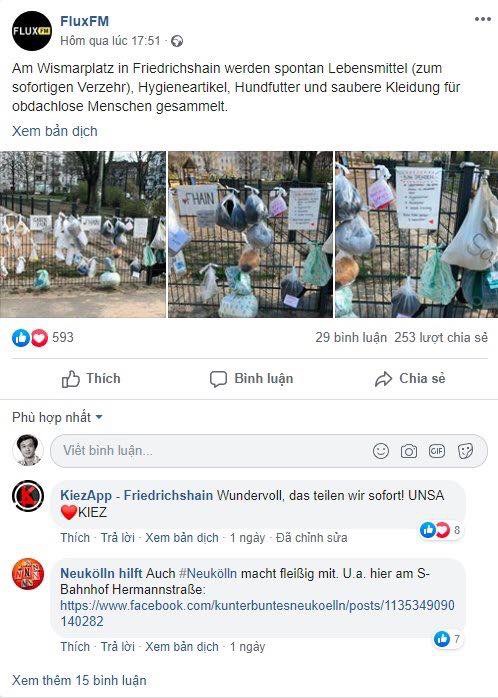 Còn nhiều nữa, còn những ông chủ tiệm bánh mì tuyên bố phục vụ không mất tiền cho những người phải ra ngoài đi làm việc cho xã hội trong thời gian này (bác sĩ, y tá, cứu thương,...), có người y tá cứu cấp bộc phát hỏi có cần giúp đỡ gì không trên FB khi một cô chăm sóc người già than rằng nơi mình làm có thể bị quá tải, có những người tình nguyện trình diện phục vụ cho bệnh viện tạm thời trên Berlin dù chưa hề có lời yêu cầu nào được phát đi.