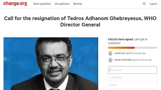 Bức thư kiến nghị ông Tedros Adhanom từ chức Tổng giám đốc WHO đã thu được hơn 530 ngàn chữ ký ủng hộ (Ảnh: Đông Phương).