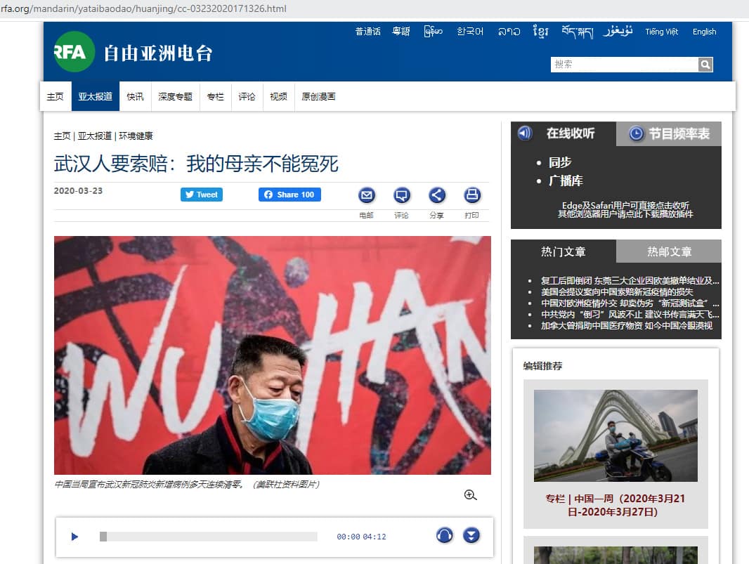 Bài viết trên Đài Á châu Tự Do và băng ghi âm của ông Đinh, tiêu đề “Cư dân Vũ Hán muốn đòi bồi thường: mẹ tôi không thể chết oan”