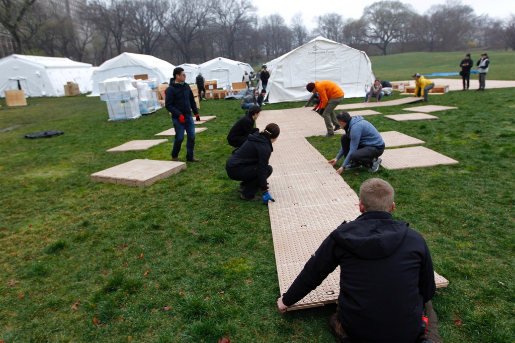 8h sáng ngày 29/3, dưới trời lất phất mưa, 20 tình nguyện viên giúp 50 nhân viên Samaritan’s Purse xây dựng 14 lều, bao phủ 4.600 m2 tại East Meadow. Đến chiều, ba lều đã dựng xong. Ảnh: Getty Images.