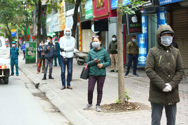 Người dân Quận Đống Đa, Hà Nội xếp hàng đảm bảo khoảng cách 2m chờ làm test nhanh Covid-19.