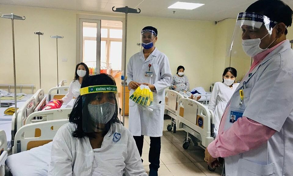 Các bác sĩ tặng mũ chắn giọt bắn tự làm cho thai phụ. Ảnh: Lê Nga.