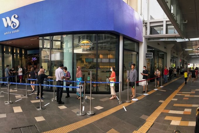 Hình ảnh người dân xếp hàng trật tự và thực hiện khoảng cách an toàn, trước khi vào trung tâm thương mại White Sands ở Pasir Ris, ngày 27/3. Ảnh: ST File.