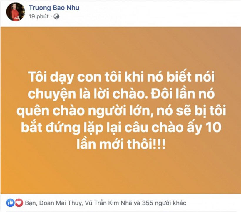 Cụ thể, trong bài viết chia sẻ: "Tôi dạy con tôi khi nó biết nói chuyện là lời chào. Đôi lần nó quên chào người lớn, nó sẽ bị tôi bắt đứng lặp lại câu chào ấy 10 lần mới thôi!" Qua lời chia sẻ này của nữ nghệ sĩ, phần nhiều giúp cộng đồng mạng hiểu rằng với phương cách giáo dục con đầy