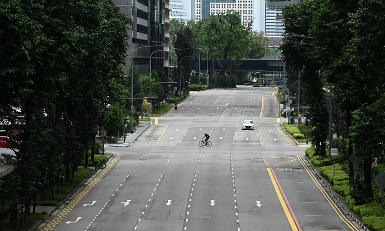 Một người đạp xe qua ngã tư đại lộ trống vắng ở khu trung tâm thương mại của Singapore sau khi lệnh đóng cửa các cơ sở không thiết yếu để ngăn nCoV có hiệu lực ngày 7/4. Ảnh: AFP.