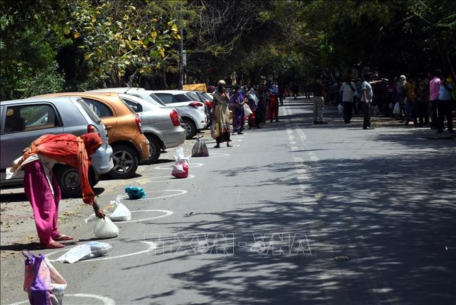Người dân nhận thực phẩm miễn phí do chính quyền địa phương hỗ trợ trong thời điểm dịch COVID-19 bùng phát tại New Delhi, Ấn Độ ngày 6/4/2020. Ảnh: THX/TTXVN