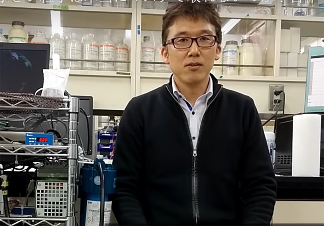 PGS.TS Tomoaki Okuda thử nghiệm khả năng chặn hạt trong không khí có kích thước tương đương virus của khẩu trang y tế, khăn giấy, vải. Ảnh chụp màn hình.