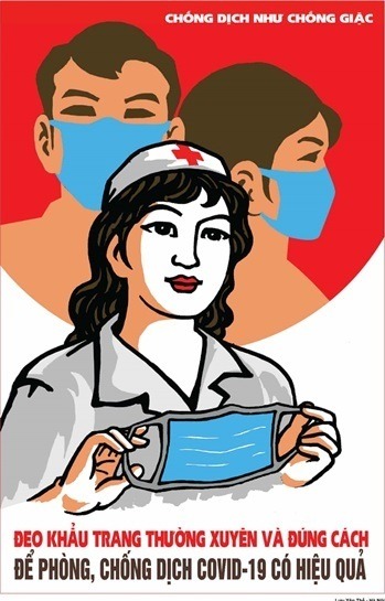 Trong bức tranh cổ động chống Covid-19 ở Việt Nam, một nhân viên y tế đeo khẩu trang đứng hiên ngang như một chiến sĩ, bên cạnh là khẩu hiệu tuyên truyền quyết liệt: "Ở nhà là yêu nước". Bên dưới, dòng chữ in nổi bật yêu cầu người dân báo cáo khi có triệu chứng hoặc bất cứ ai trốn cách ly.