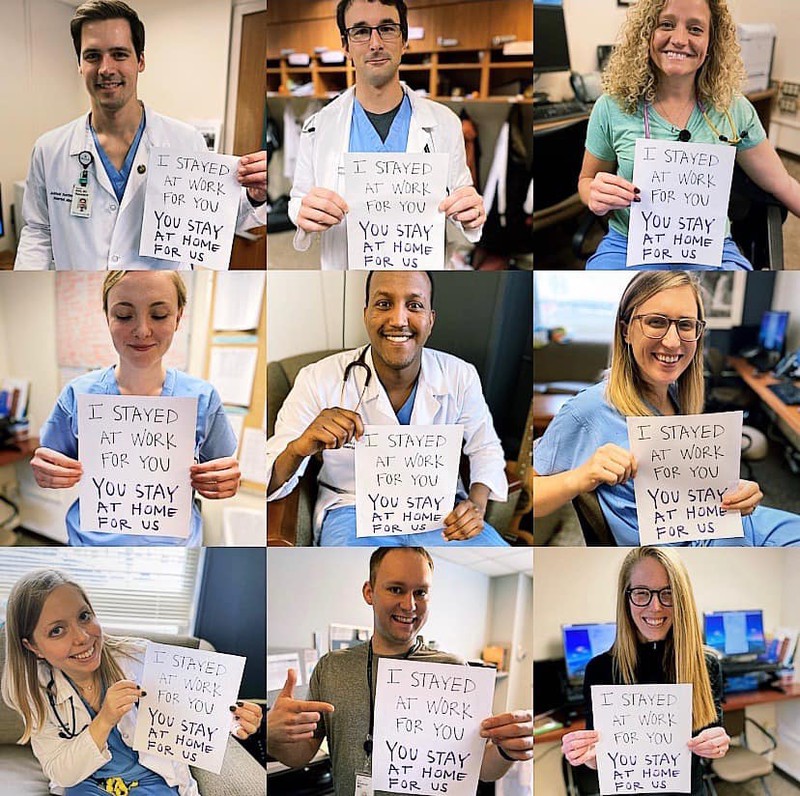 Thông điệp kêu gọi người dân ở nhà của các y bác sĩ bệnh viện Abbott Northwestern ở TP Minneapolis, bang Minesota (Mỹ) – “Chúng tôi đi làm vì bạn, bạn hãy ở nhà vì chúng tôi”. Ảnh: FACEBOOK
