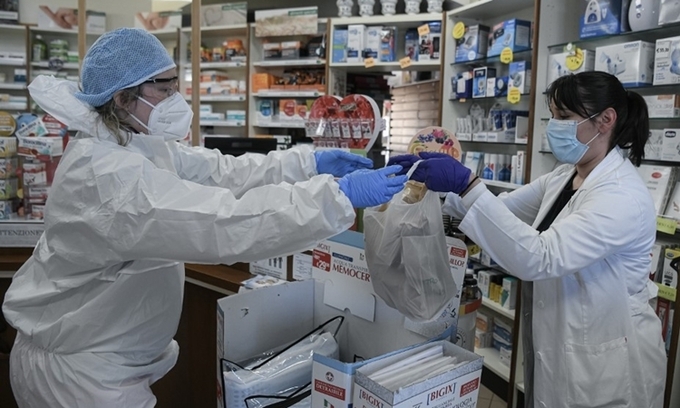 Nhân viên y tế trao thuốc cho hiệu thuốc ở Palagano, Italy ngày 9/4. Ảnh: AFP.