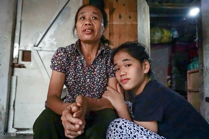 Mẹ con bà Dung trước cửa phòng trọ trong xóm lao động, chiều 15/4. Ảnh: Hoàng Phương.