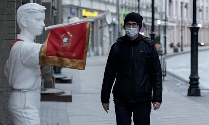 Người đàn ông đeo khẩu trang phòng dịch đi qua tượng thiếu niên tiền phong thời Liên Xô trên đường phố Moska, Nga hôm 15/4. Ảnh: Reuters.