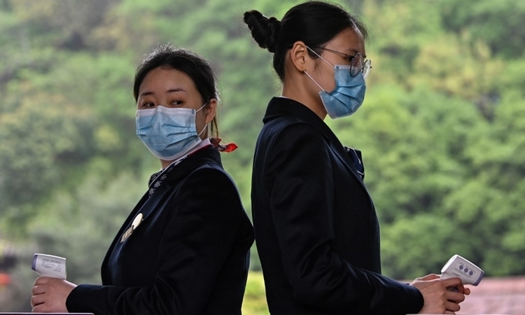 Nhân viên kiểm tra thân nhiệt tại một điểm tham quan ở Vũ Hán ngày 10/4. Ảnh: AFP.
