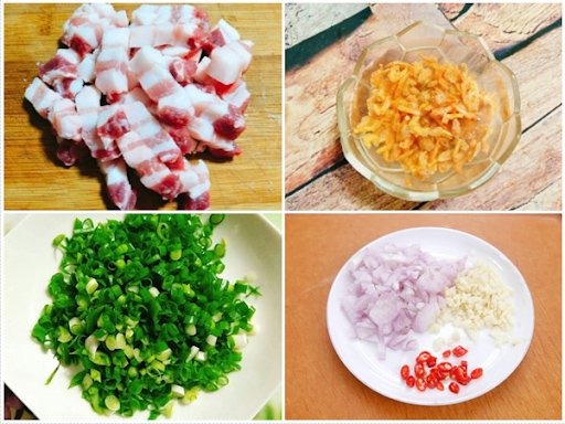 - Thịt ba chỉ bỏ bì, thái nhỏ hạt lựu