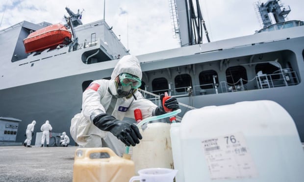 Nhân viên y tế Đài Loan tẩy trùng tàu Panshi. Ảnh: Guardian.
