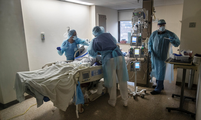 Nhân viên y tế chăm sóc bệnh nhân Covid-19 tại Bệnh viện Brooklyn, New York hồi cuối tháng 3. Ảnh: NYTimes.