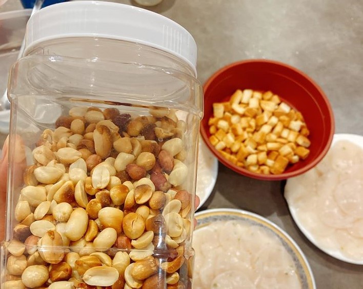 Sau đó, bạn rưới lạc đã rang và bánh mì chiên giòn lên đĩa bánh đã bày trước đó, chan nước mắm và thưởng thức.