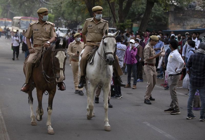 Cảnh sát tuần tra đường phố ở Prayagraj, Ấn Độ ngày 28/4. Ấn Độ tuần trước đã giảm bớt việc phong tỏa bằng cách cho phép các cửa hàng mở cửa trở lại và các hoạt động sản xuất, canh tác được nối lại ở các vùng nông thôn để giúp hàng triệu người nghèo có thu nhập hàng ngày.