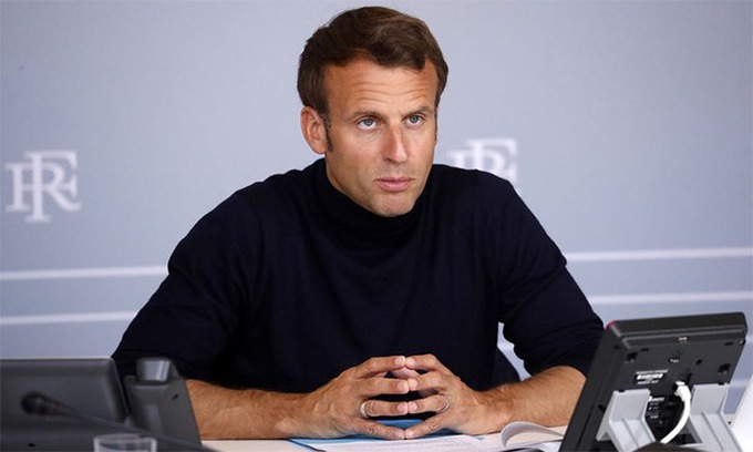 Tổng thống Pháp Emmanuel Macron trong cuộc họp trực tuyến với lãnh đạo các vùng lãnh thổ hải ngoại tại Điện Elysee, Paris, ngày 30/4. Ảnh: Reuters.