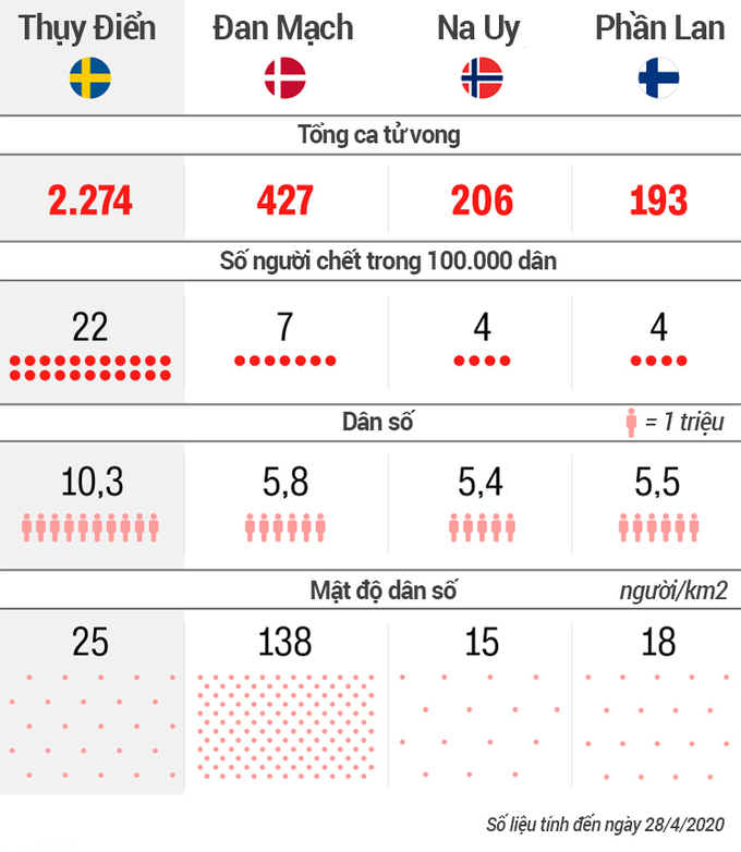 Tuy nhiên, những con số thống kê dường như "phản bội" những tuyên bố đầy tự tin về chiến lược "một mình một kiểu" của Thụy Điển. Tỷ lệ tử vong của Thụy Điển đang cao hơn hẳn nhiều quốc gia châu Âu khác, chạm ngưỡng 22 trên 100.000 dân, theo số liệu của Đại học Johns Hopkins. Trong khi đó, con số này của Đan Mạch chỉ là 7, Na Uy và Phần Lan là 4.