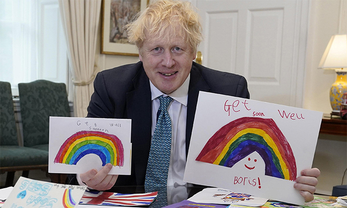 Thủ tướng Anh Boris Johnson khoe thiệp chúc bình phục tại văn phòng ở số 10 phố Downing, London, ngày 28/4. Ảnh: AFP.