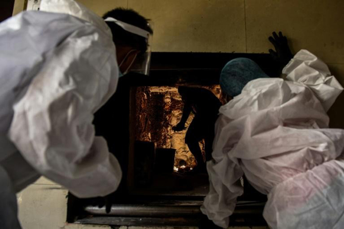 Nhân viên nhà hỏa táng ở thủ đô Manila, Philippines, đang hỏa thiêu thi thể. Ảnh: AFP.
