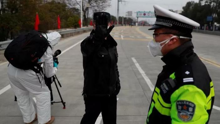 Một cảnh sát ngăn phóng viên chụp ảnh tại chốt an ninh gần sông Trường Giang, thành phố Cửu Giang, tỉnh Giang Tây, Trung Quốc, hồi tháng hai. Ảnh: Reuters