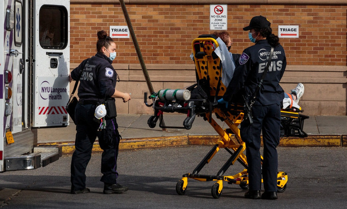 Nhân viên y tế vận chuyển bệnh nhân tại Brooklyn, New York, hồi đầu tuần. Ảnh: NY Times.